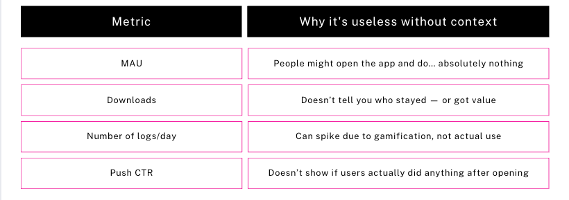 → Sounds impressive, but doesn’t tell you whether users are actually doing anything valuable.App downloads